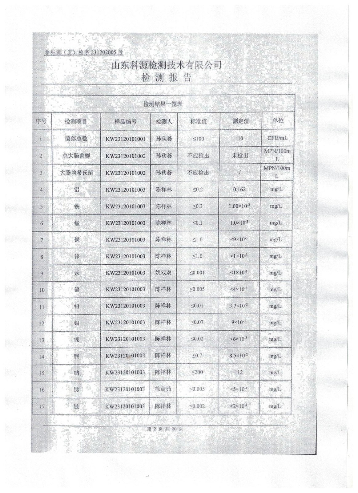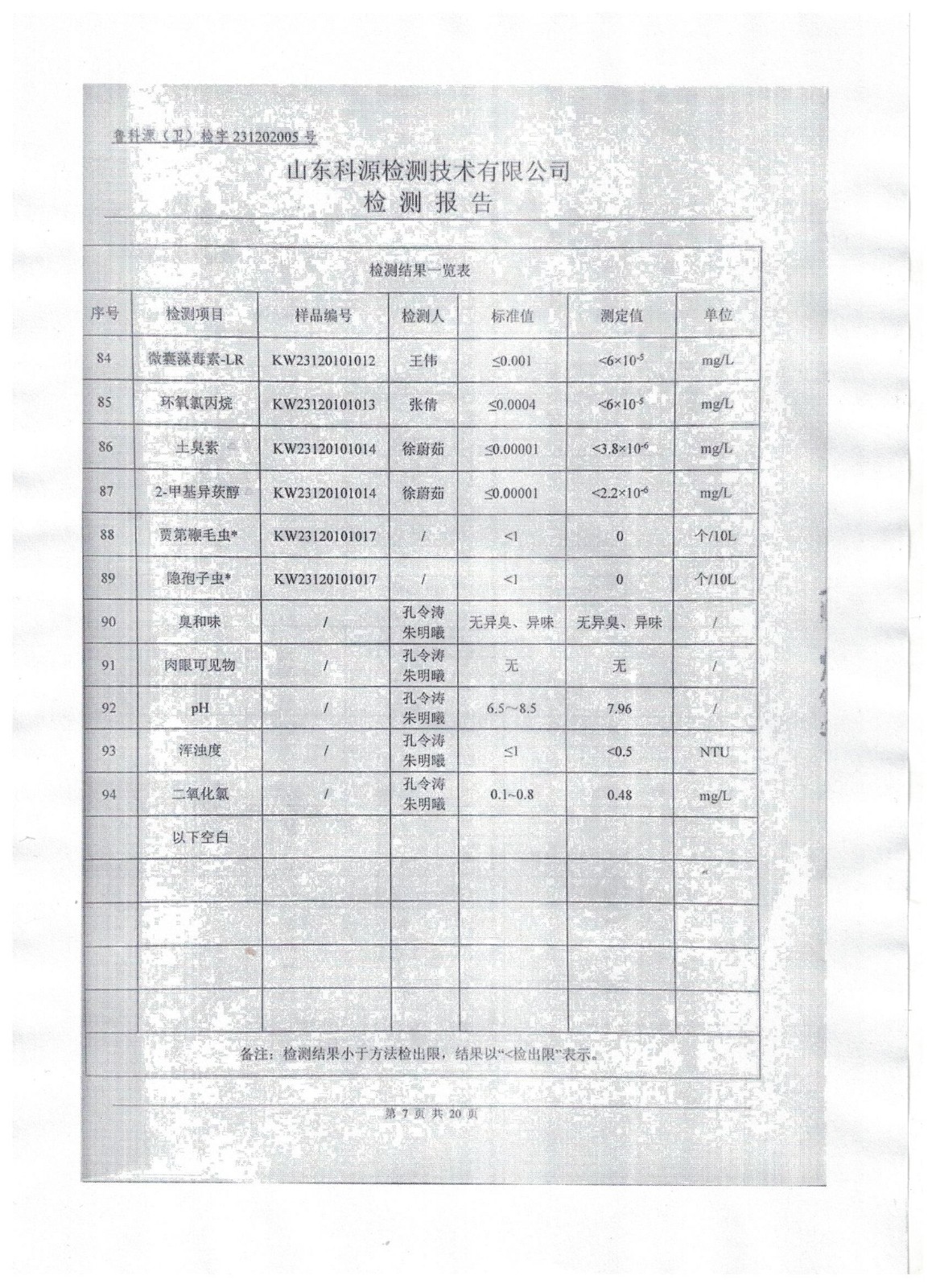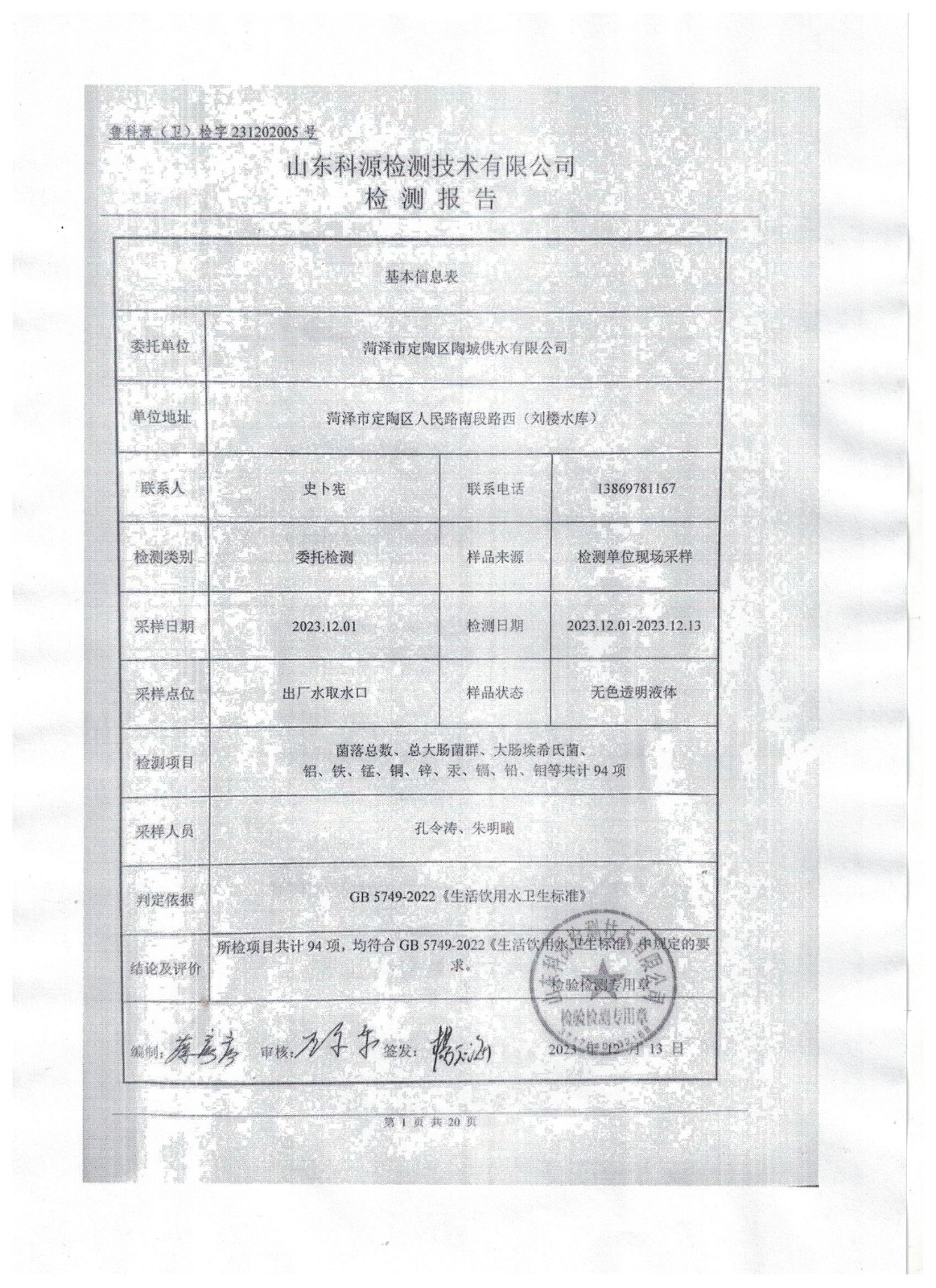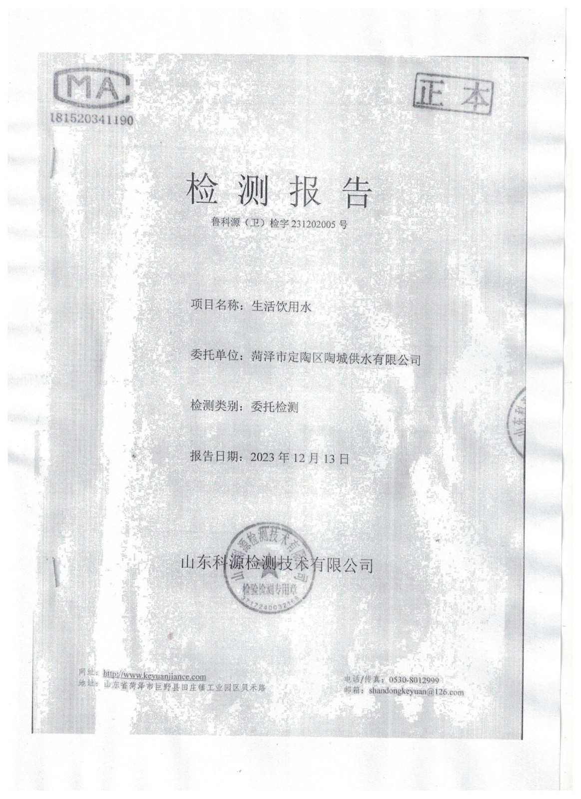 2023年12月份水质检测公告